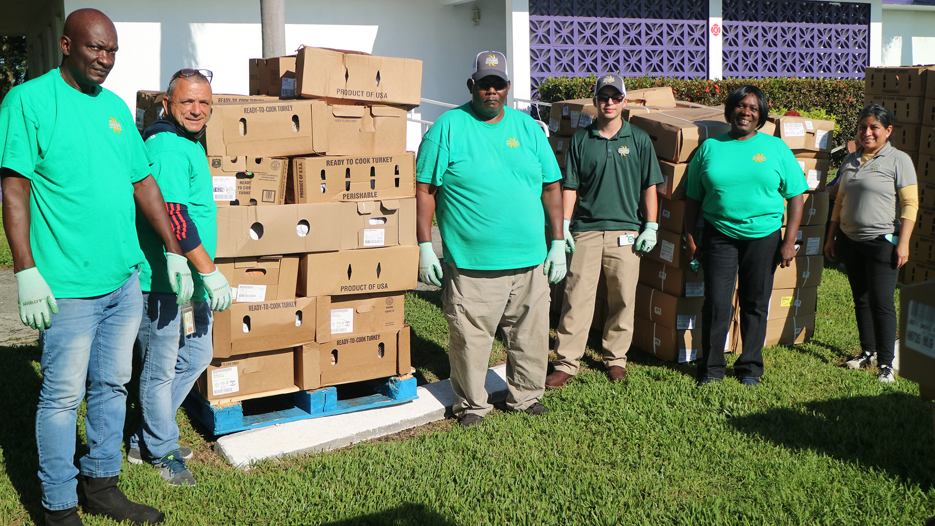 From left: Nasser Severain, Juan de Dios Morales Martinez, Melvin James, Johan Acevedo, recently retired Florida Crystals employee Loretta Gaines and Caroline Villanueva helped hand out Thanksgiving dinner staples to hundreds of families in the Glades.