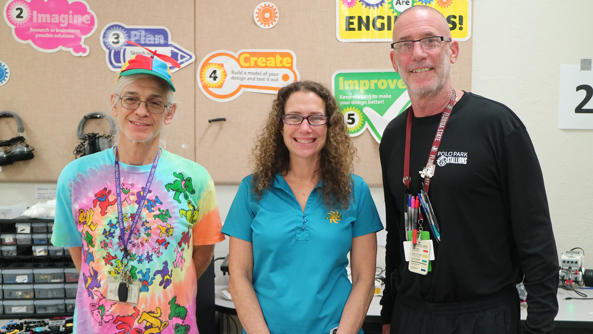From left: Polo Park Middle School science teacher Roy Bernstein; Shari Hanauer, Director, Consumer Products Distribution; and Polo Park engineering teacher and Robotics Club sponsor David Grad.