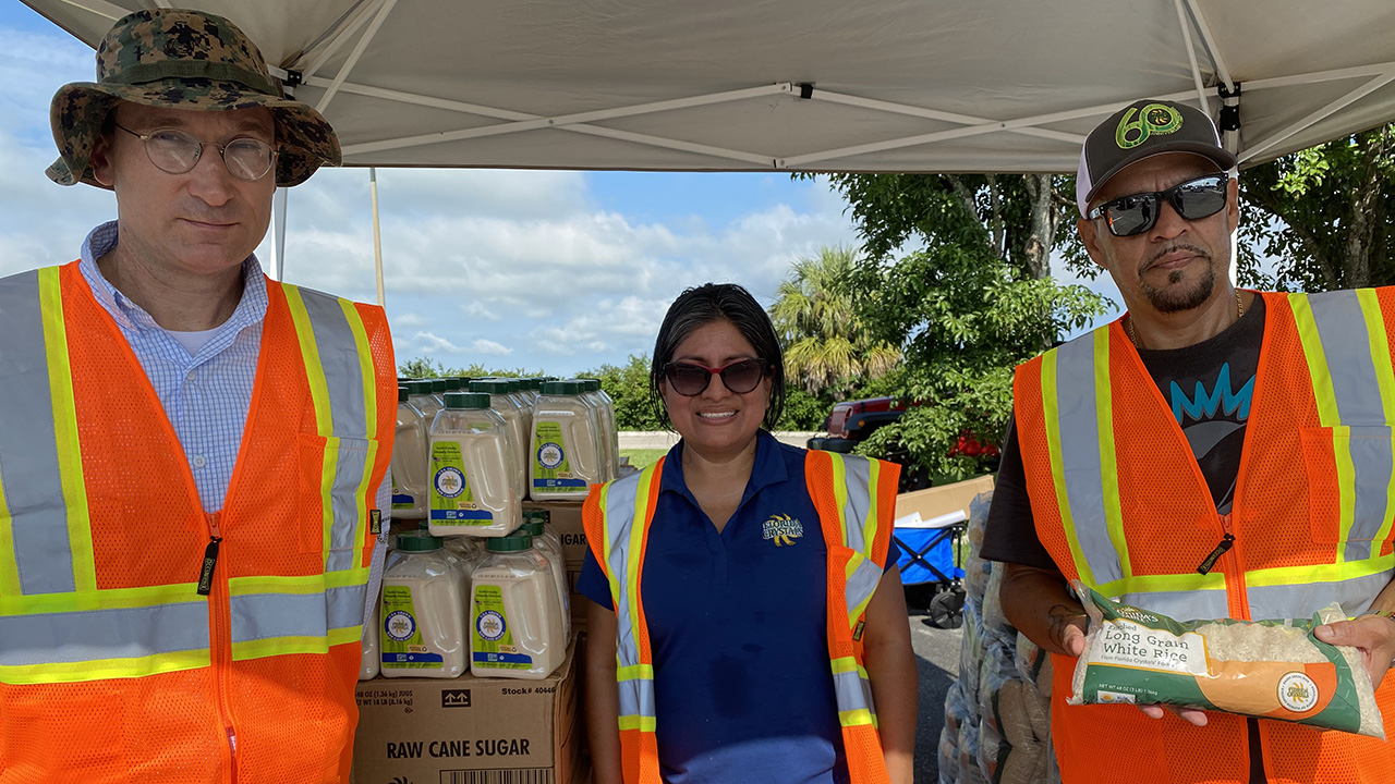 Ben Sadler (from left) helps to distribute our organic raw cane sugar and locally grown rice at a back-to-school event July 24 in Belle Glade with Caroline Villanueva and Joaquin Almazan.